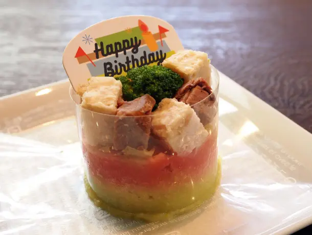 原材料:さつまいもペースト(国内製造)、ローストビーフ、チキンミートボール(鶏肉、でん粉)、キャベツ、枝豆ペースト、ブロッコリー、ビーツ水煮(ビーツ、食塩)、(一部に牛肉・大豆・鶏肉を含む) ※写真はイメージです