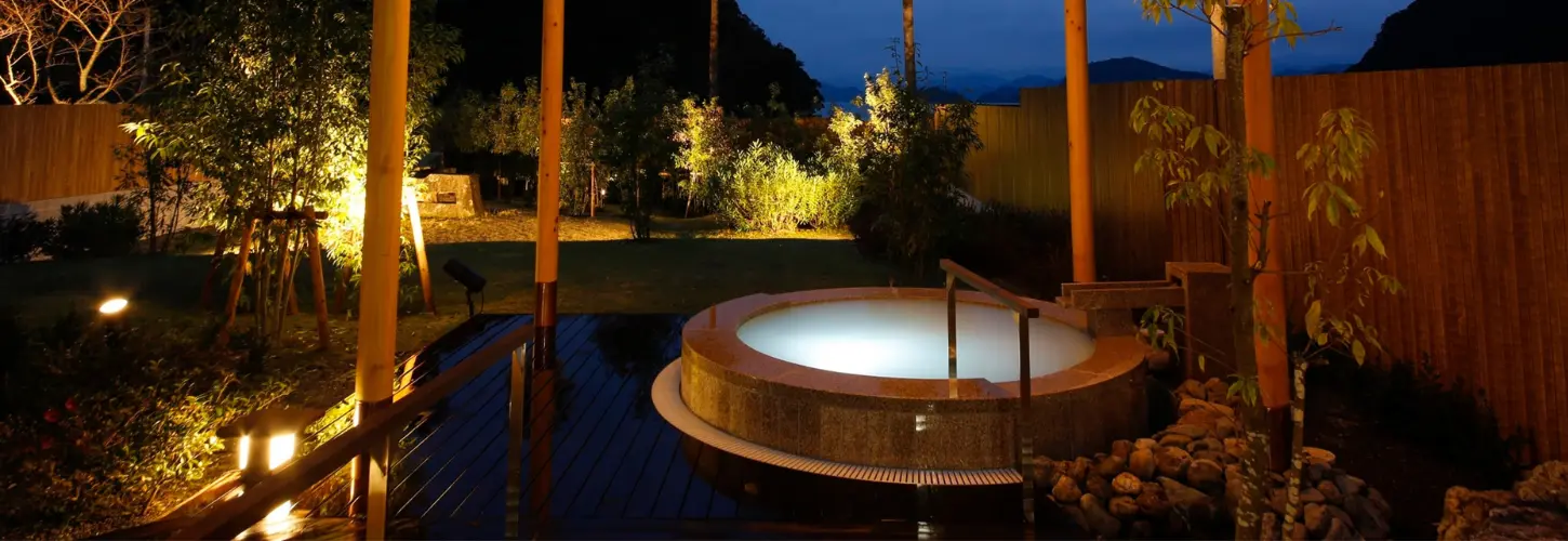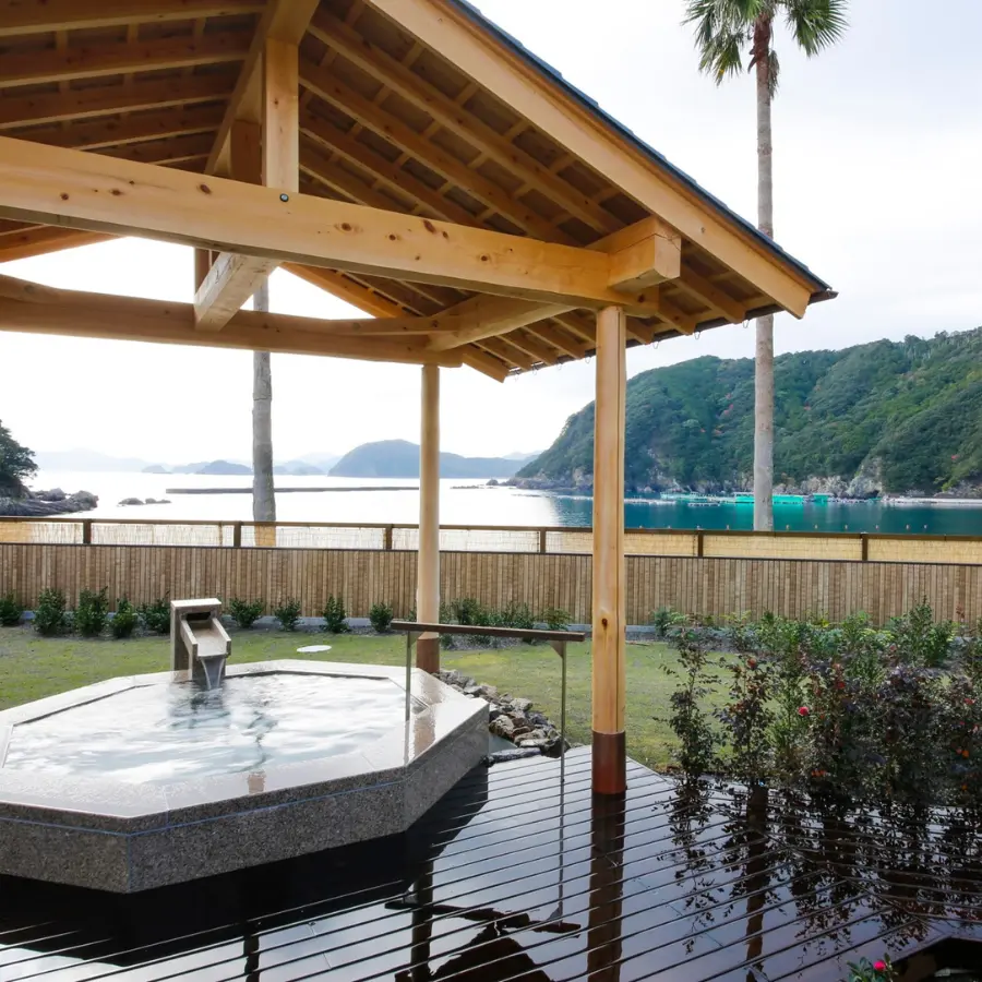 2015年12月に一部リニューアルした「沐亭(もくてい)」。 露天風呂や大浴場をはじめ、貸切風呂や湯上がり処もございます。 露天風呂では、朝には熊野の海と熊野の山、夜には星空が綺麗に見えます。