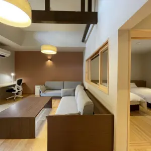ワーキングデスク、オフィスチェア、高速Wi-Fi、テレビ(ネット動画アプリ対応)、電話、エアコン、電子レンジ、 お茶・コーヒーセット、冷蔵庫(容量:90ℓ / ドリンク持ち込み可)、加湿空気清浄機、湯沸かしポット、洗浄機付きトイレ、金庫